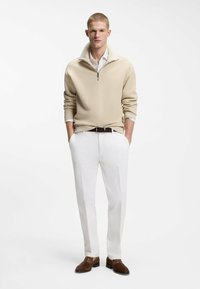 Giovane uomo in piedi con le mani in tasca che indossa un maglione beige con mezza zip, camicia bianca, pantaloni bianchi, cintura marrone e mocassini marroni su sfondo bianco.
