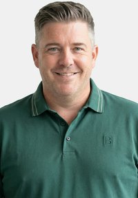 Uomo di mezza età che sorride, indossa una polo verde scuro con colletto a righe beige e pantaloni beige chiaro, con le mani in tasca, in piedi davanti a uno sfondo neutro.