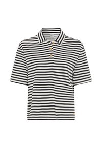 Giovane donna sorridente, che indossa una polo a righe orizzontali bianche e nere a maniche corte e pantaloni bianchi, con la mano in tasca.