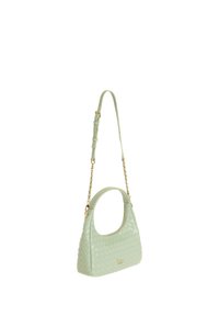 Borsa a tracolla in pelle intrecciata verde chiaro con manico curvo, tracolla regolabile, cerniera dorata e piccolo logo metallico sul davanti.