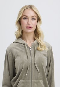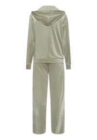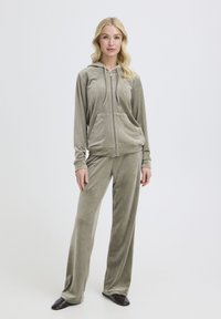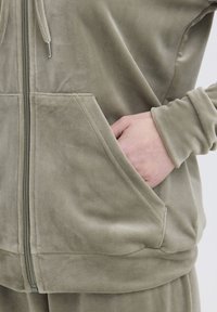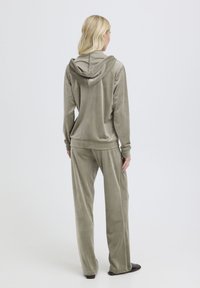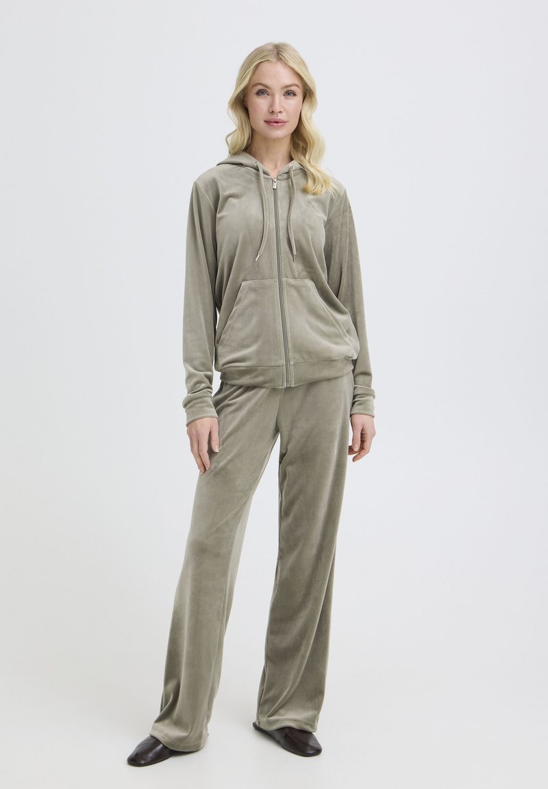 Donna bionda in piedi con indosso una felpa con zip in velluto di colore grigio chiaro e pantaloni a gamba larga abbinati, con scarpe nere, su sfondo chiaro uniforme.