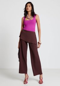Donna con top senza maniche magenta, pantaloni a vita alta marrone scuro con texture, collana multicolore a più strati con perline e braccialetti spessi.