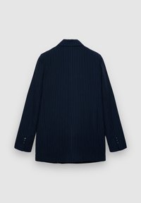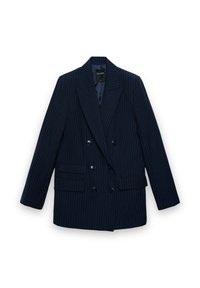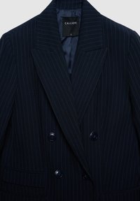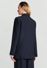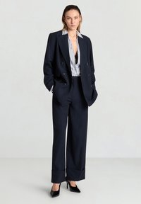 Donna con le mani in tasca che indossa un completo doppiopetto a righe blu navy e una camicia a righe con colletto, su sfondo neutro.