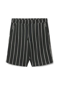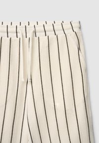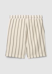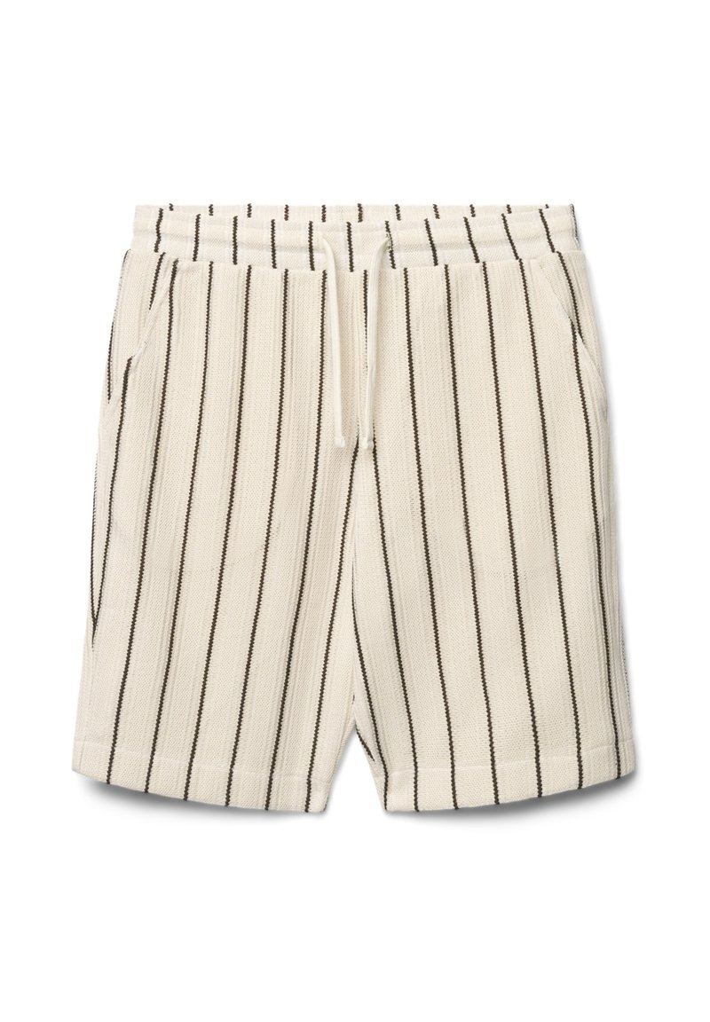 Pantaloncini beige a maglia con strisce verticali nere, fascia elastica in vita con coulisse e tasche anteriori laterali.