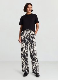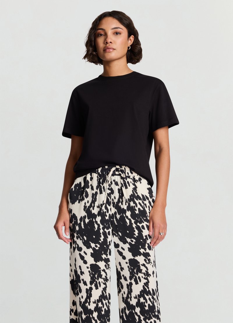 Maglietta nera a maniche corte abbinata a pantaloni a vita alta, ampi, con sfondo crema e motivi a schizzi neri.