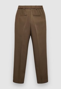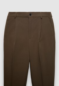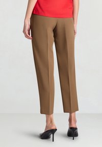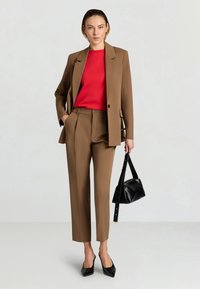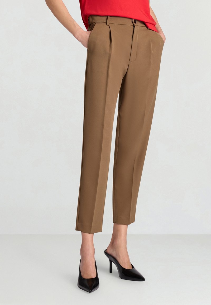 Pantaloni marroni su misura alla caviglia con pieghe frontali, indossati con mule nere a punta con tacco alto e una maglia rossa.