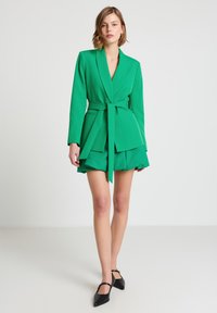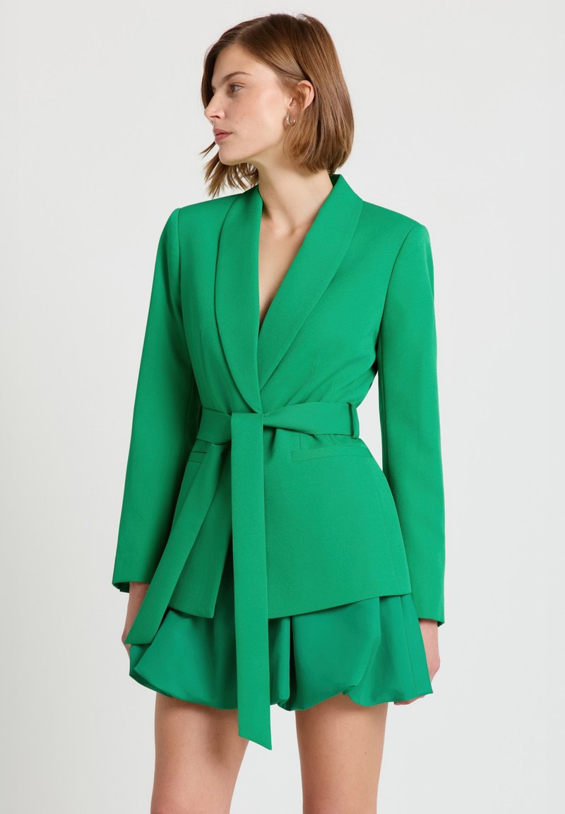 Donna che indossa un blazer verde brillante con cintura e pantaloncini svasati abbinati, che guarda verso sinistra su uno sfondo chiaro e uniforme.