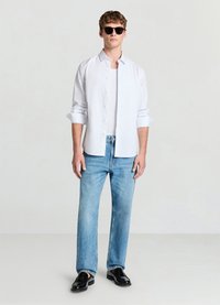 Camicia bianca con bottoni e colletto appuntito, maniche lunghe e tessuto liscio, abbinata a occhiali da sole scuri e jeans di denim blu.