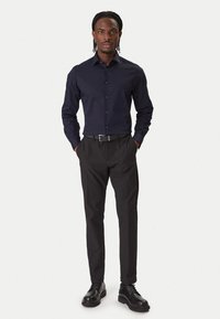 Camicia a maniche lunghe blu navy con chiusura frontale con bottoni e colletto. Tessuto liscio, vestibilità su misura, abbinata a pantaloni scuri e cintura nera.