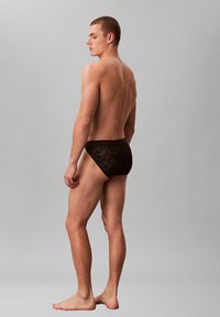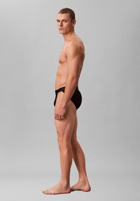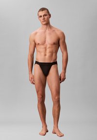 Uomo muscoloso con capelli corti che indossa slip neri Calvin Klein, in piedi con le mani dietro la schiena su sfondo grigio uniforme.