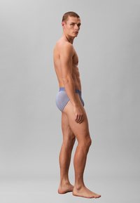 Modello maschile con capelli corti in piedi contro uno sfondo grigio, indossa slip blu Calvin Klein, con una mano appoggiata sulla spalla.