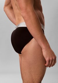 Giovane uomo in piedi con le mani dietro la schiena, indossando slip neri Calvin Klein su sfondo grigio uniforme.