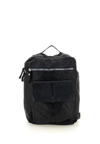 Zaino in pelle nera con superficie testurizzata, più scomparti con cerniera, spallacci regolabili e una tasca frontale. Design pulito e minimalista.