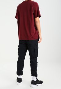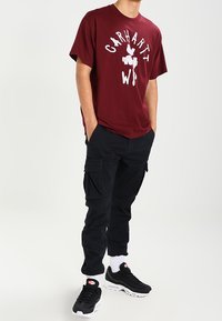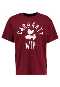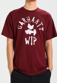 T-shirt in cotone borgogna con testo bianco audace che recita "Carhartt WIP" e grafiche di un uccello e un manubrio. Maniche corte, vestibilità rilassata.