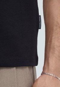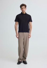 Uomo con capelli ricci che indossa una polo nera a maniche corte e pantaloni beige plissettati, in piedi con una mano in tasca.