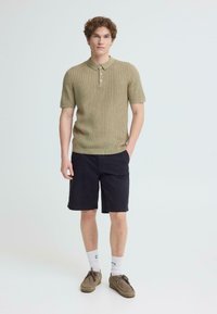 Uomo che indossa pantaloncini neri fino al ginocchio, calzini bianchi alti con logo nero e scarpe stringate in suede marrone, in piedi su sfondo bianco.