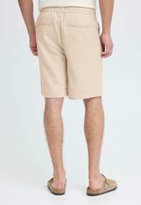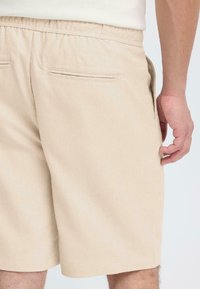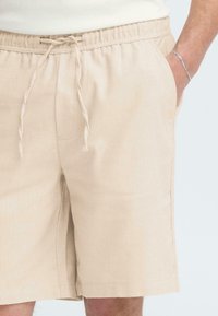 Pantaloncini beige in lino con vita elastica e coulisse. Finiscono a metà coscia con una vestibilità comoda. Indossati con scarpe beige senza lacci.