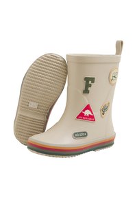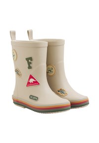Stivale da pioggia in gomma beige con suola a righe colorate, caratterizzato da varie toppe tra cui uno stegosauro e la lettera "F".