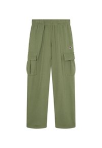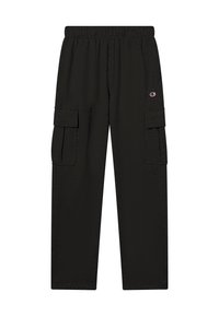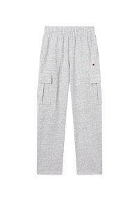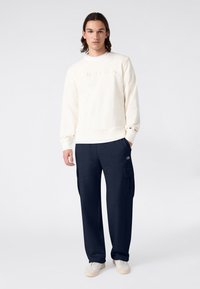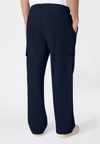 Uomo che indossa pantaloni cargo da jogging blu navy e sneakers bianche, in piedi con una mano in tasca contro uno sfondo semplice.