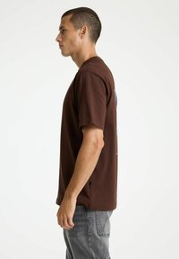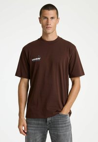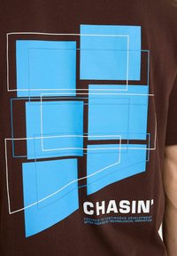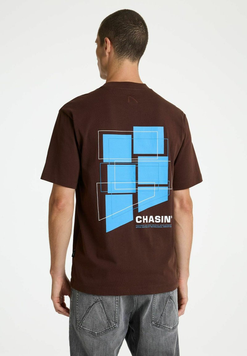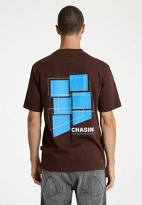Uomo che indossa una t-shirt marrone con un disegno geometrico quadrato blu e la scritta "CHASIN'" sul retro, abbinata a jeans grigi sbiaditi, visto di spalle.