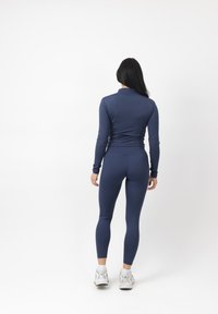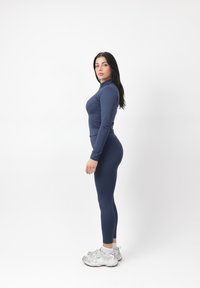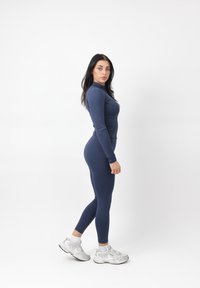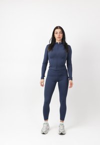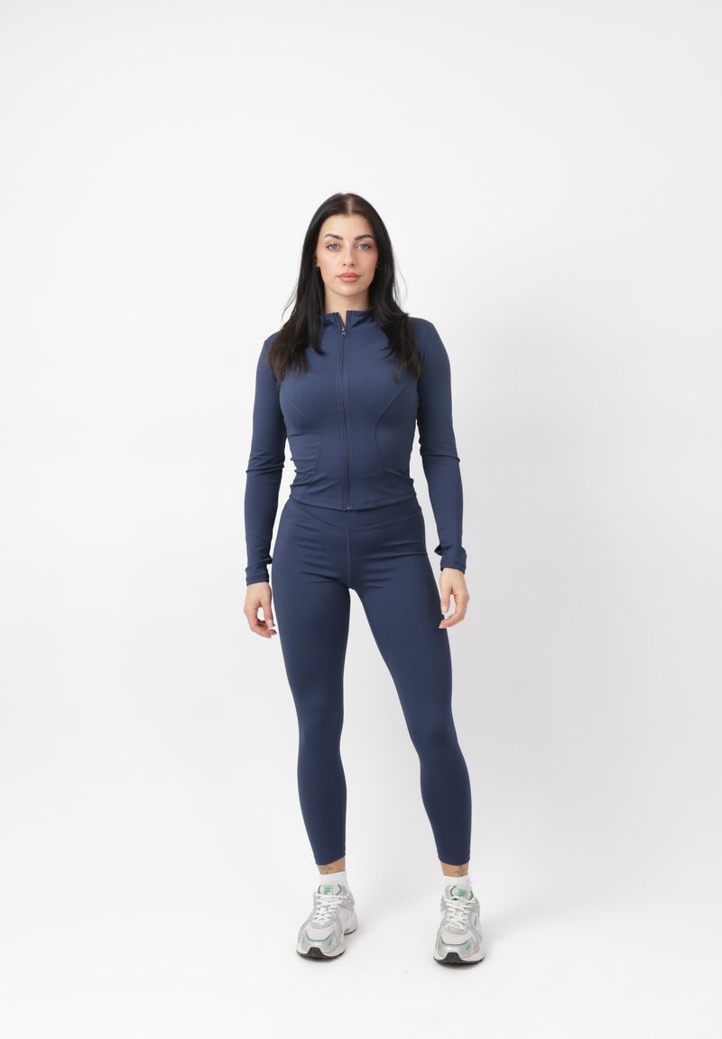 Donna in piedi di fronte, indossa una giacca attillata blu navy con cerniera e leggings, con scarpe da ginnastica bianche su sfondo bianco.