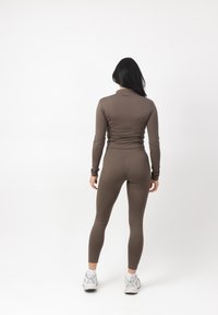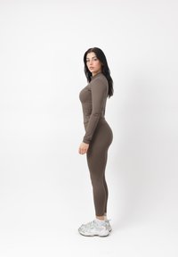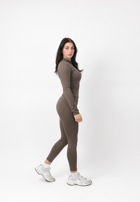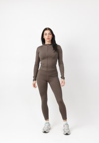 Donna in piedi, rivolta in avanti, che indossa una giacca marrone aderente con zip, leggings abbinati e scarpe sportive bianche su sfondo bianco.