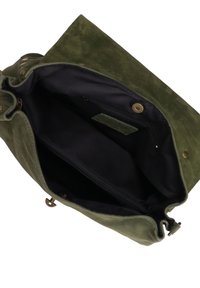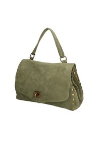Borsa a tracolla verde in suede con una forma strutturata, caratterizzata da un ribaltabile, hardware dorato e borchie decorative lungo il lato. Inclusa una tracolla rimovibile.