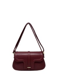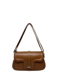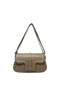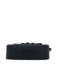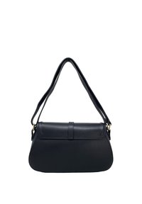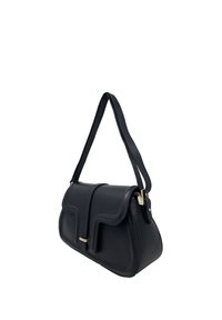 Persona con indosso un completo nero che tiene una borsa in pelle nera strutturata con doppi manici su uno sfondo grigio uniforme.