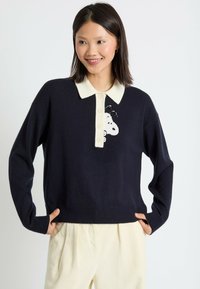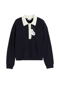 Maglione a maglia blu navy con colletto crema e bottoni. Presenta un ricamo di Snoopy sul petto. Tessuto morbido, vestibilità comoda.