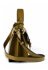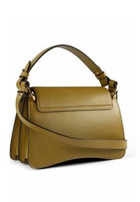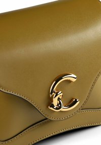 Pantaloni neri a gamba larga abbinati a una maglia a maniche lunghe in raso color crema. Viene indossata una piccola borsa a tracolla verde oliva con un dettaglio argentato.