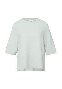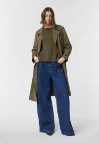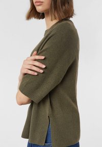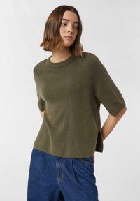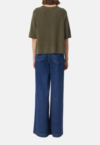 Donna che indossa un maglione a maniche corte color verde oliva e jeans blu a vita alta e ampi, in piedi davanti a uno sfondo neutro.
