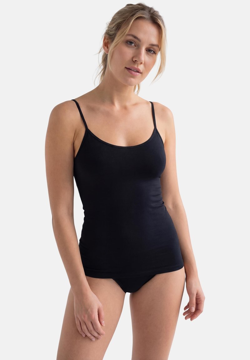 Giovane donna con capelli biondi in un top nero e biancheria intima coordinata, in piedi contro uno sfondo chiaro e semplice.