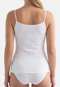 Giovane donna con capelli biondi che indossa una canottiera bianca e biancheria intima bianca, in piedi contro uno sfondo chiaro e semplice.