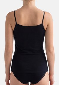 Giovane donna con capelli biondi, indossa un top bianco con spalline sottili e mutandine bianche abbinate, in piedi contro uno sfondo semplice.