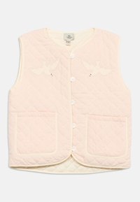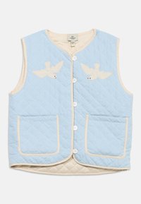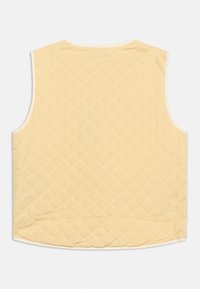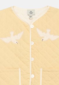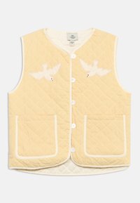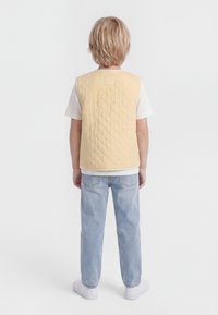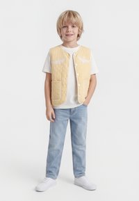 Ragazzo biondo che indossa una t-shirt bianca, un gilet trapuntato giallo con disegni di uccelli, jeans azzurri e sneaker bianche, in piedi con una mano in tasca.