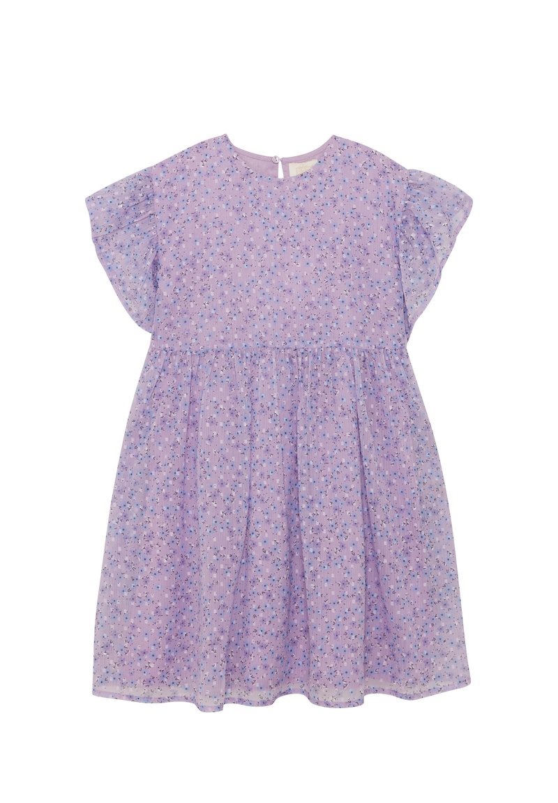 Vestito lilla a maniche corte con stampa floreale piccola, scollo rotondo, vita arricciata e chiusura con bottone a goccia sul retro.
