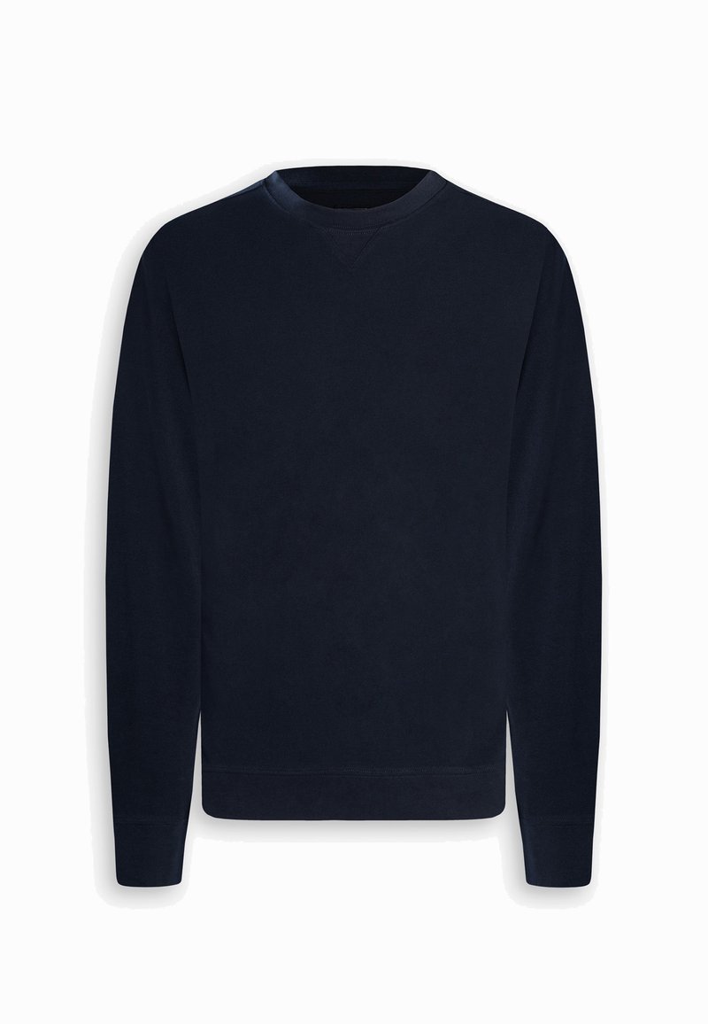Felpa blu navy a maniche lunghe con scollo rotondo, polsini e orlo a costine, mostrata distesa su uno sfondo bianco.