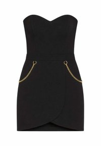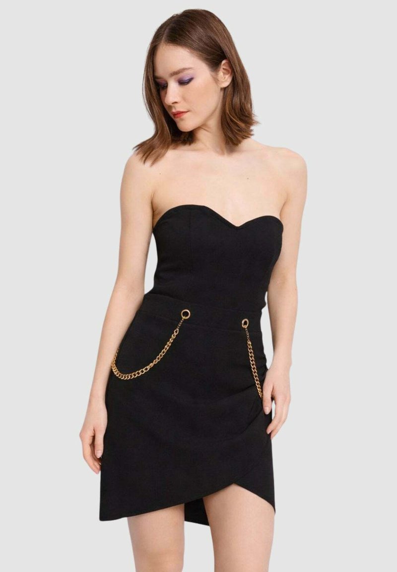 Abito nero senza spalline con scollo a cuore, caratterizzato da dettagli in catena dorata sulle tasche e un design con orlo asimmetrico.