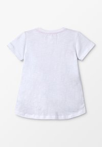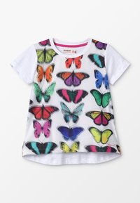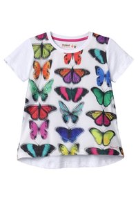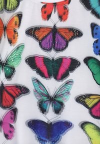 T-shirt bianco a maniche corte con una vivace stampa di farfalle di diverse dimensioni e colorazioni, con scollo rotondo e vestibilità rilassata.