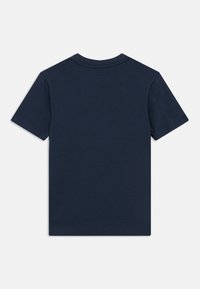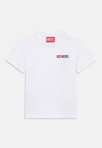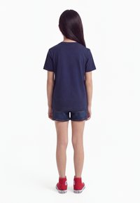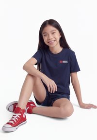 Ragazza con lunghi capelli scuri seduta a gambe incrociate, indossa una t-shirt Diesel blu scuro, pantaloncini di jeans e sneakers alte rosse, sorride alla fotocamera.