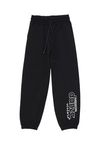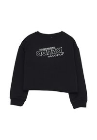 Felpa nera corta con testo bianco "DIMENSIONE danza sisters" e pantaloni felpati neri abbinati con lo stesso logo vicino alla caviglia.