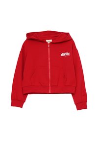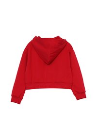 Set di felpa rossa con cappuccio e pantaloni tuta, realizzato in tessuto morbido. La felpa presenta una zip frontale, tasche e un logo stampato. I pantaloni hanno un cinturino elastico e tasche cargo.