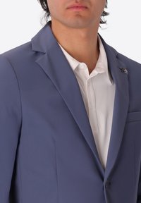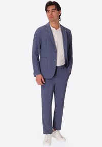 Uomo che indossa una giacca e pantaloni blu sopra una camicia bianca abbottonata, che guarda leggermente di lato su uno sfondo neutro.