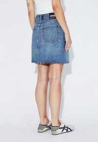 Gonna di jeans azzurro chiaro con taglio dritto, orlo sfrangiato, tasche frontali e chiusura con bottoni, abbinata a sneakers color crema.