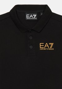 Polo nera a maniche corte con colletto, tre bottoni e logo dorato EA7 Emporio Armani sul petto sinistro.