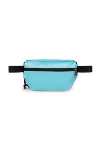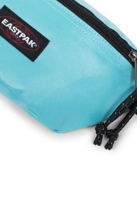 Marsupio di color azzurro chiaro realizzato in tessuto resistente, con zip nera, logo Eastpak e una finitura testurizzata. Include una tracolla regolabile.