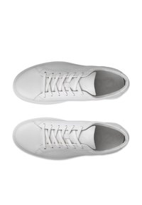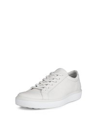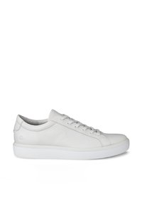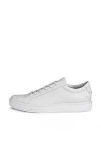 Sneaker bianca in pelle a basso profilo con chiusura con lacci e suola testurizzata, mostrata dal lato esterno su sfondo bianco.
