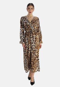 Abito avvolgente in stampa leopardata nelle tonalità di marrone e crema, con maniche lunghe, vita cintrata e gonna fluente. Tacchi alti neri.