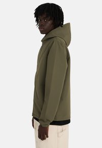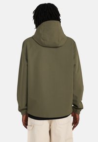 Giacca verde oliva con zip e cappuccio, con polsini elasticizzati e un semplice logo sul petto. Realizzata in tessuto leggero e liscio.