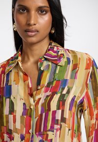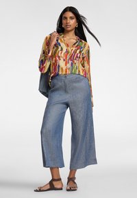 Donna che indossa una camicetta con bottoni dal motivo astratto colorato e pantaloni blu a vita alta, in piedi con una mano in tasca.